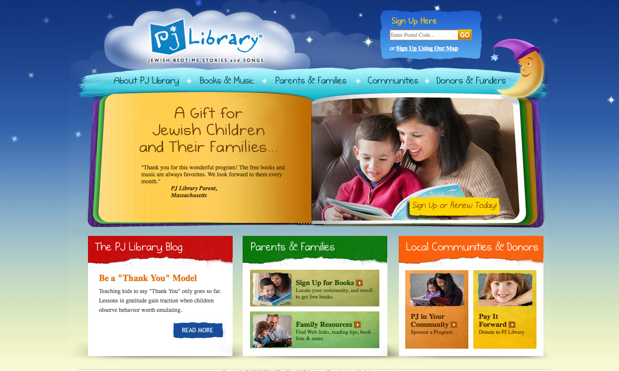 PJ Library is a program of the Harold Grinspoon Foundation, made possible through partnerships with philanthropists and local Jewish organizations. Today, families in hundreds of communities across the United States and Canada are able to explore the timeless core values of Judaism through books and music.